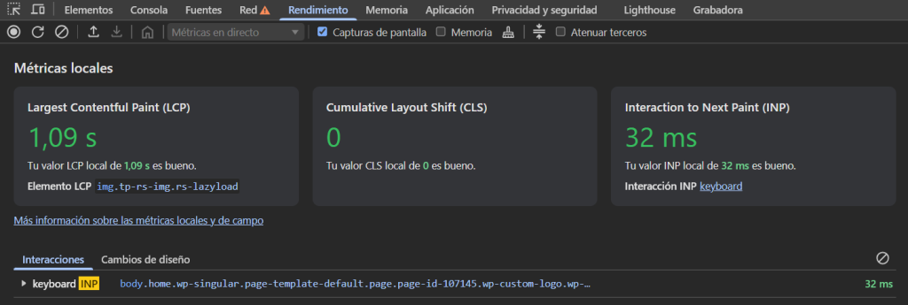 - Interaction to Next Paint (INP): 32 ms (muy por debajo de los 200 ms recomendados).